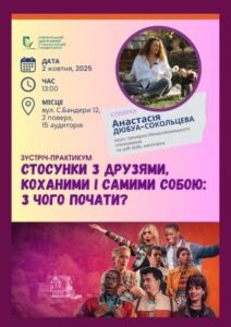 З нагоди Всесвітнього дня ментального здоров’я на кафедрі образотворчого та декоративно-прикладного мистецтва імені Степана Шевчука відбулася виховна година для першокурсників, спрямована на поліпшення адаптації. Формат заходу — зустріч‑практикум «Стосунки з друзями, коханими і собою: з чого почати?». Спікерка — Анастасія Дюбуа, коучка та менторка з ненасильницького спілкування.