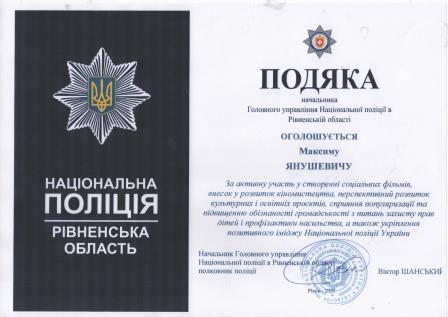 За участь у соціальному проєкті «Код підлітка» Максим Янушевич був нагороджений Подякою начальника Управління Національної поліції в Рівненській області — за активну участь у створенні соціальних фільмів, внесок у розвиток кіномистецтва, перспективний розвиток культурних і освітніх ініціатив, сприяння популяризації та підвищенню обізнаності громадськості з питань захисту прав дітей і профілактики насильства, а також за укріплення позитивного іміджу Національної поліції України.